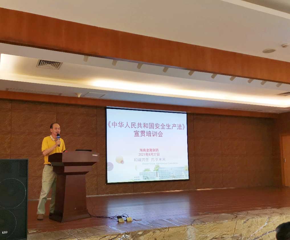海南皇隆制藥股份有限公司高度重視此次新安全生產(chǎn)法的頒布實(shí)施,為了提高全體員工對(duì)新《安全生產(chǎn)法》的認(rèn)識(shí),全面加強(qiáng)安全生產(chǎn)法治觀念,提升企業(yè)安全管理水平,2021年8月27日組織開(kāi)展新《安全生產(chǎn)法》宣貫培訓(xùn)會(huì)議,公司安委會(huì)主任陳益智、副主任史江永、何晶及陳國(guó)華、馬和東、葉華等16名安委會(huì)成員、公司專職(兼職)安全員、各部門(mén)領(lǐng)導(dǎo)及骨干成員等參加了此次培訓(xùn)