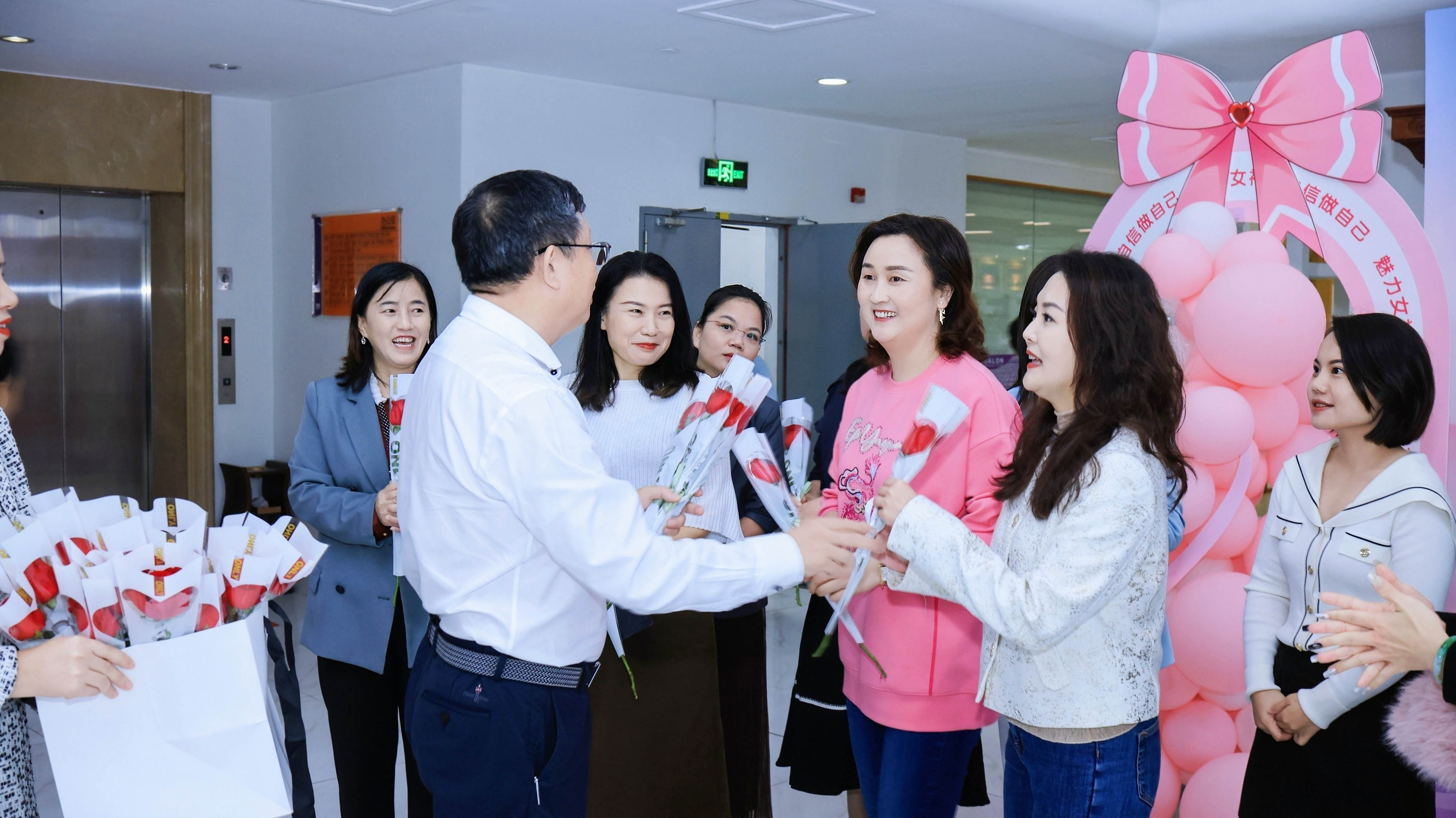 隨后,在陳總帶領下,何晶、肖俊南、陳峙托、李周龍、陳國華等領導逐一給全體女職工們送上表示親切慰問的鮮花和祝福的巧克力。